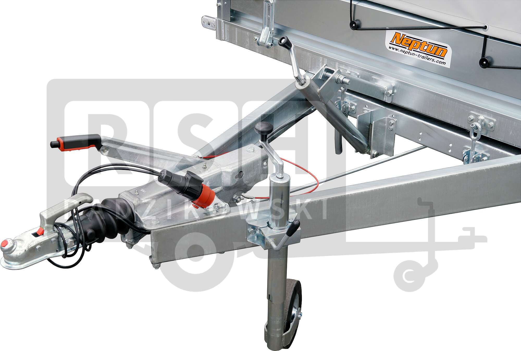 • Dużą wytrzymałość konstrukcji zapewnia całkowicie spawana rama, zimnogięte podłużnice ramy oraz 4 poprzeczne belki oraz mocny dyszel strzałkowy spawany. Wszystkie elementy cynkowane ogniowo,