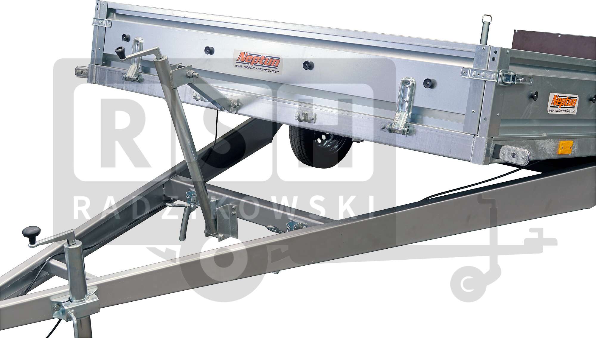 • Skrzynia przyczepy jest uchylna i wyposażona w podnośnik śrubowy,